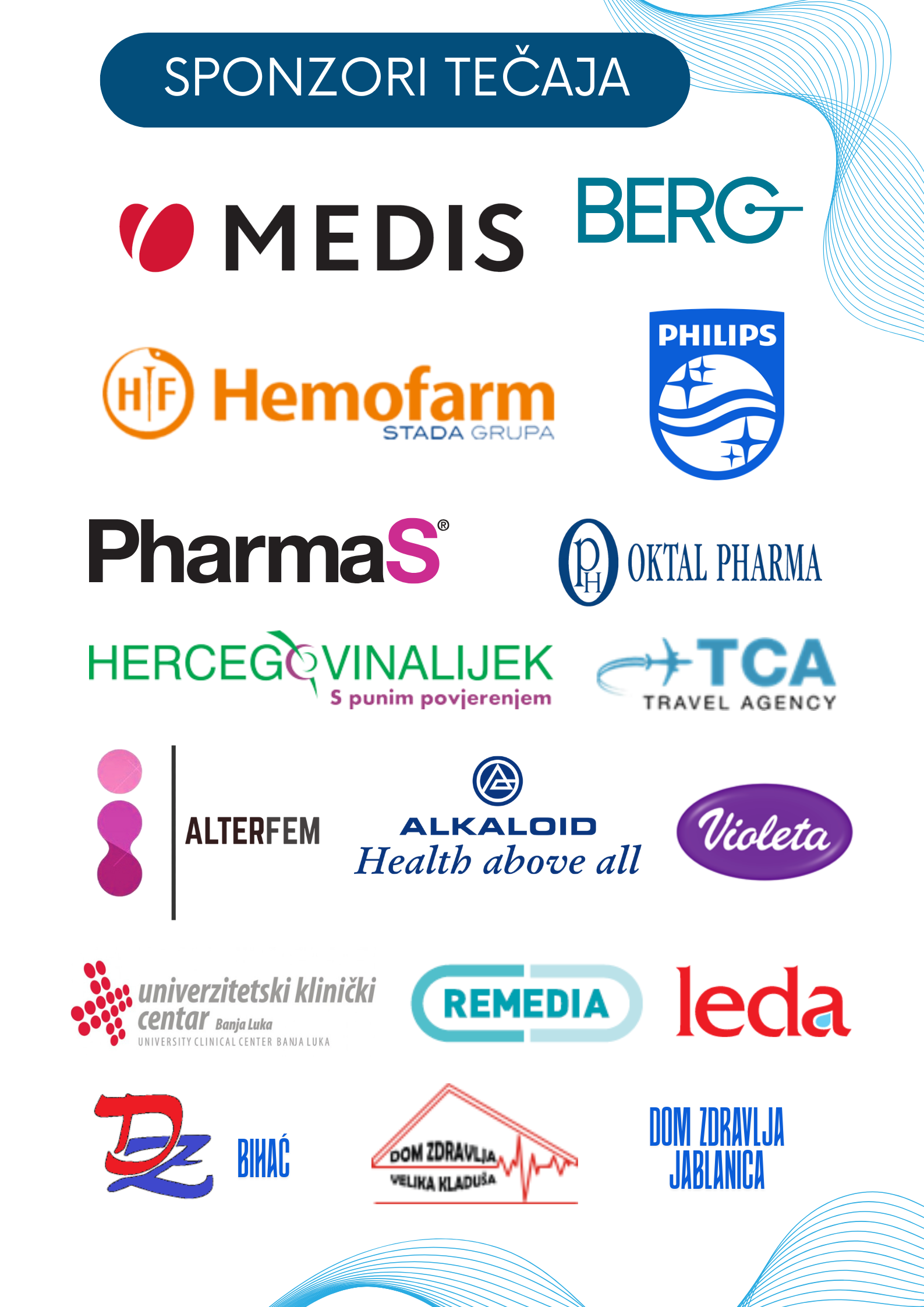 Zahvaljujemo i našim sponzorima tečaja, koji su stalna potpora svim aktivnostima Udruge/Udruženja za perinatalnu medicinu u BiH, prepoznavajući aktivnosti Udruge/Udruženja kao vrlo važne u segmentu perinatalne medicine.
